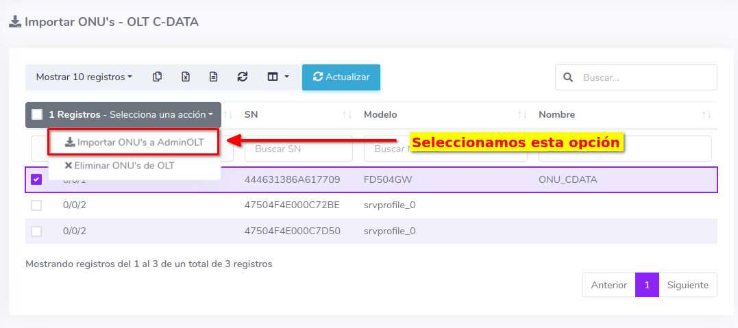 3Una vez que hayamos seleccionado los equipos, importamos las ONU's al sistema AdminOLT