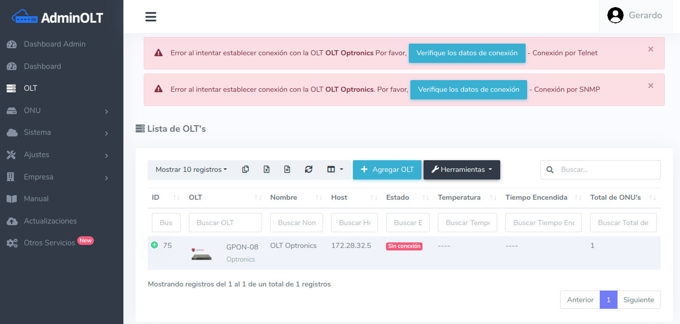 5 Verificar la conexión de su OLT en AdminOLT (en caso de que no haya conexión por SNMP y Telnet es porque su OLT aún no cuenta con las configuraciones iniciales).