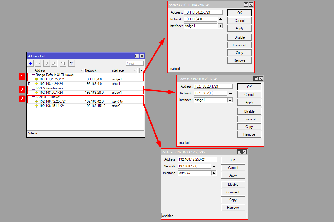 - 1.- Agregamos el segmento default de la OLT: 10.11.104.0/24 para que el mikrotik tenga comunicacion con la OLT