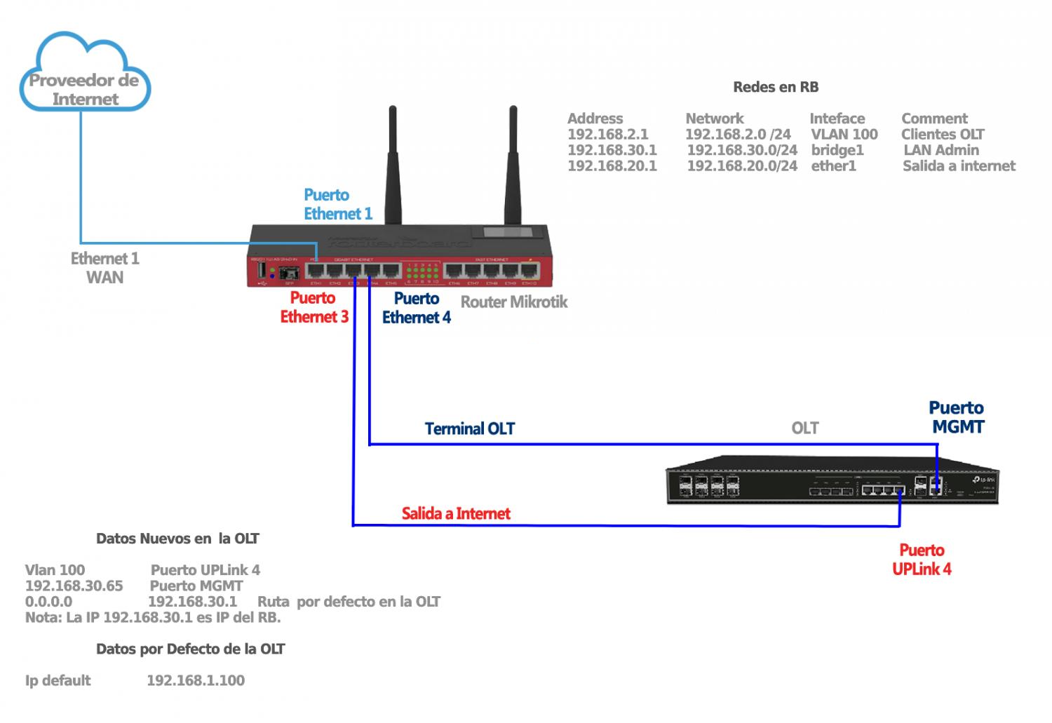 Para tener más clara como se estructura la conexión de la OLT al momento de realizar la configuración, puede apoyarse del siguiente diagrama, sobre como realizar la conexión física.