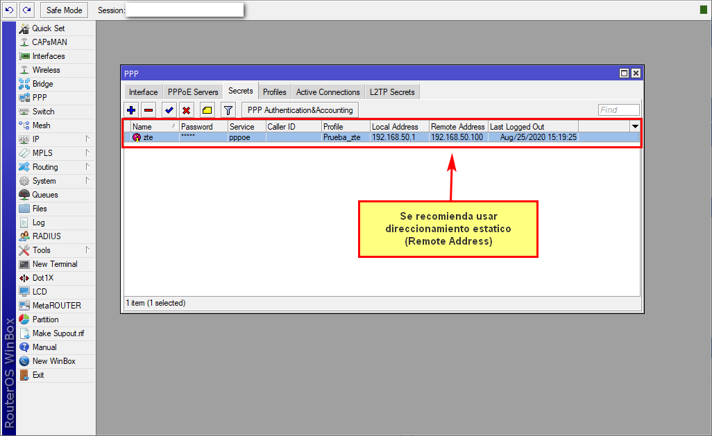 3 Una vez que hayamos asignado el usuario PPPoE (secret), verificamos que tengamos salida a internet