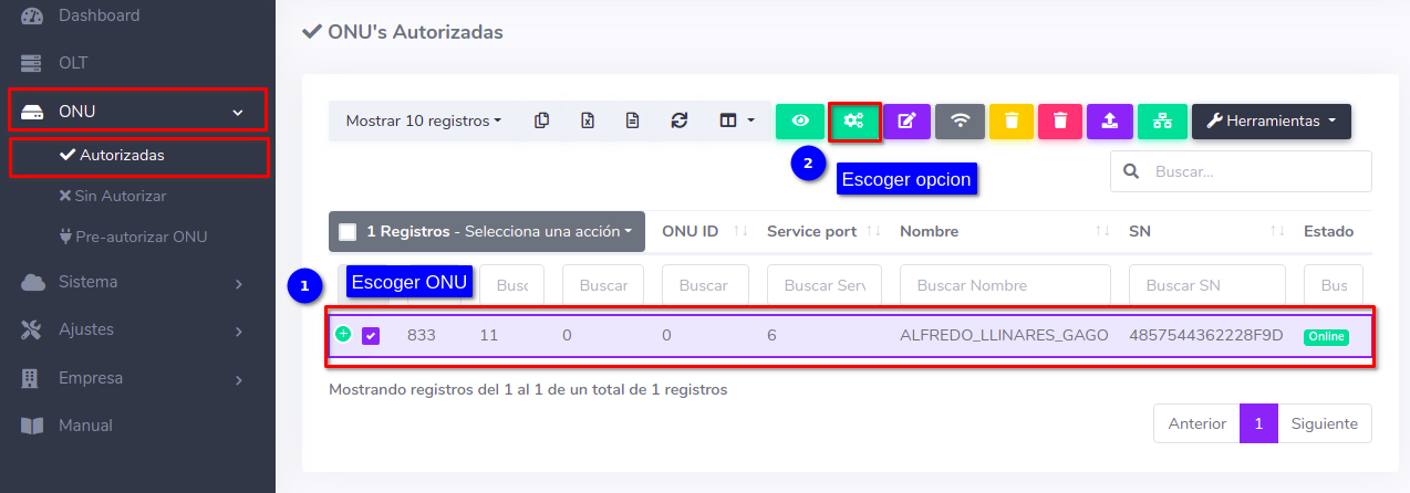 Desde AdminOLT podemos editar información de una: