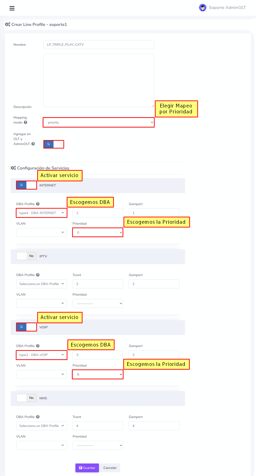 El Triple Play es la capacidad de dar servicio de internet, televisión y telefono a través de nuestra red de fibra óptica. Para ello es necesario que configuremos esos servicios desde AdminOLT